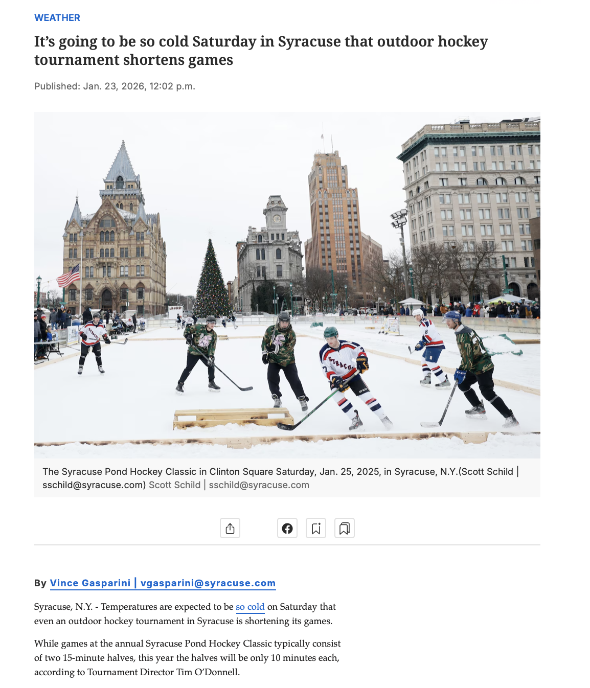 Syracuse, N.Y. -- The bracket is set for the 2026 Syracuse Pond Hockey Classic Presented by VInny Lobdell and Family, a one-day outdoor hockey tournament in downtown Syracuse on Saturday, January 24. 16 teams from across the Central New York region will begin round robin play at 10 a.m. culminating in final round competition under the lights in historic Clinton Square at 6 p.m.