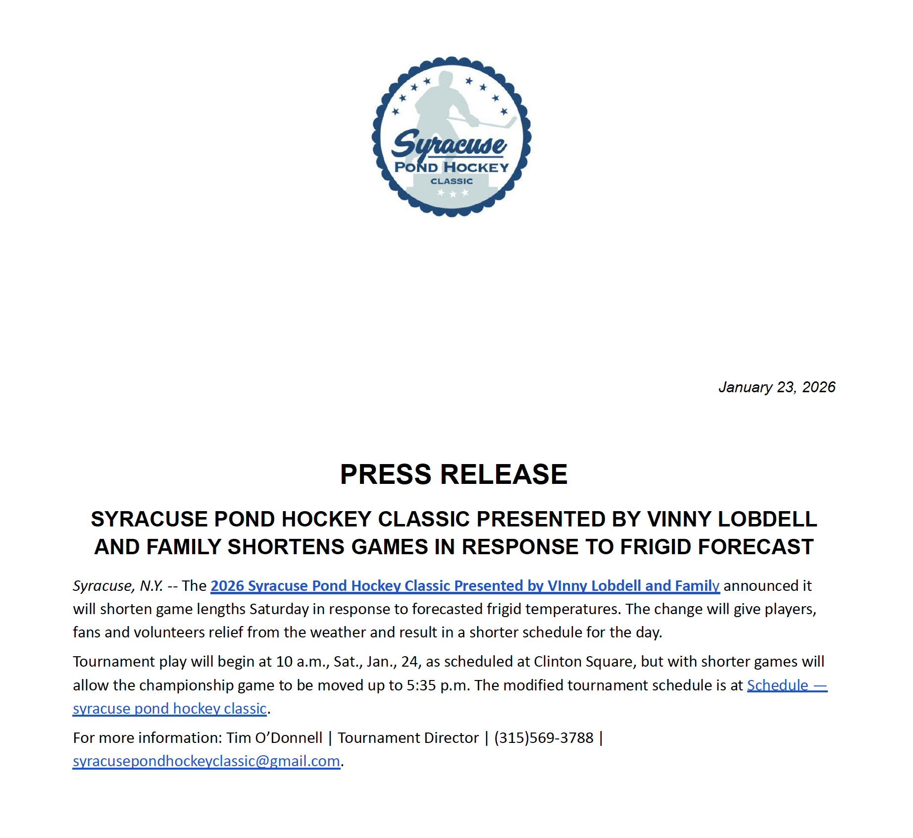 For more information: Tim O’Donnell | Tournament Director | (315)569-3788 | syracusepondhockeyclassic@gmail.com.